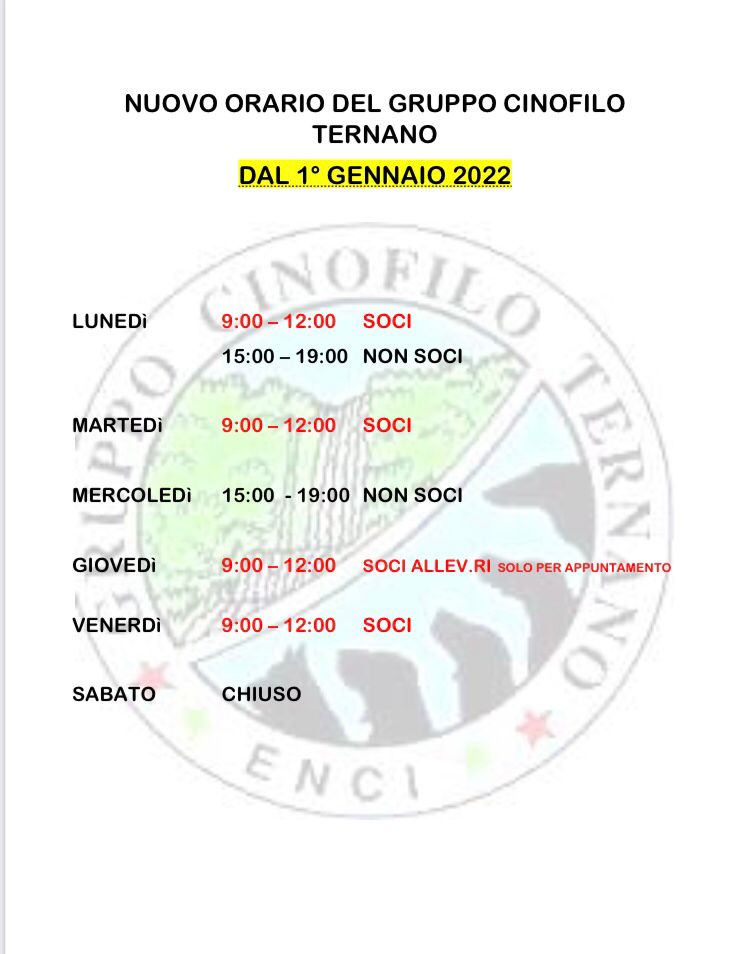 Pubblicato il 10 Gennaio, 2022 da Gruppo Cinofilo Ternano NUOVO ORARIO 2022- ORARIO DAL 1 GENNAIO 2022LUNEDI9.0012.00SOCI15.0019.00NON SOCIMARTEDI’9.0012.00SOCIMERCOLEDI15.0019.00NON SOCIGIOVEDI’9.0012.00APPUNTAMENTOALLEVATORIVENERDI’9.0012.00SOCI